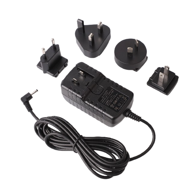 Wall-mount power adapter with interchangeable global plug options – ideal for telecom and industrial applications.